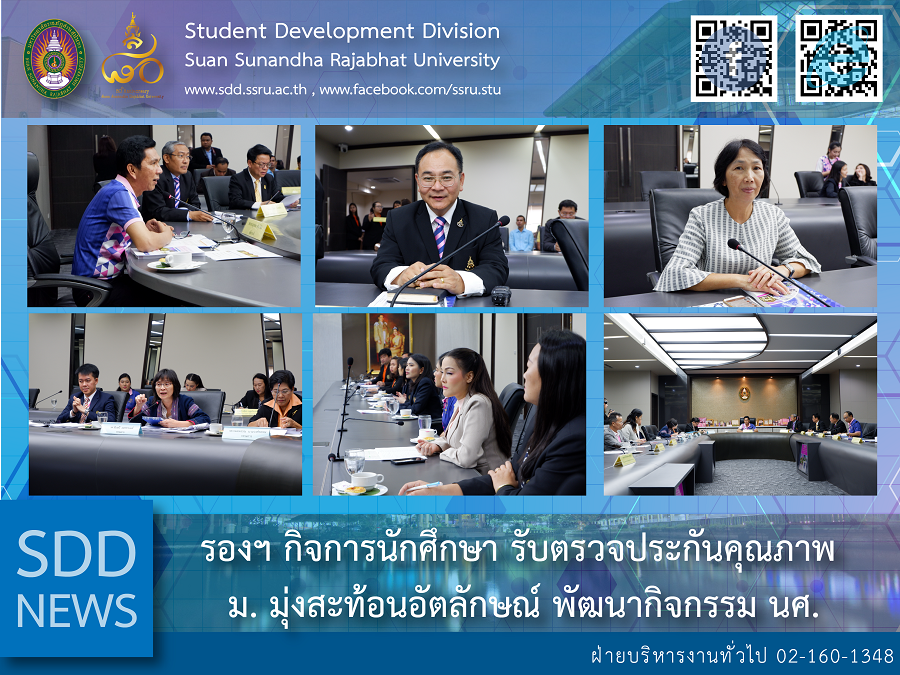 (11 Oct 2018) Asst. Prof. Dr. Chananart Meenanan, Vice-President for Student Affairs and Mrs. Pornpris Praditpong, Director of Student Development Division (SDD) attended the InternalQuality Assurance Assessment of Suan Sunandha Rajabhat University for Academic Year 2017 which SDD was assigned for 2 indicators; Indicator 1.4 Services for undergraduate (Process) and Indicator 1.5 Activities for undergraduate (Process). SDD has promoted the beneficial activities representing the student’s identity – “Practitioner, Expert in Academic, Communication, Cognitive Thinking and Public Consciousness”, and highly focused on student development and service mind.