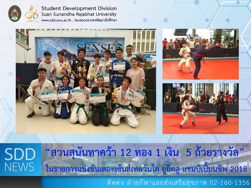 (7 Oct 2018) Mr. Sompong Ingkanantasit, Acting Head of Sport and Health Promotion Section, Student Development Division brought the athletes to join “The Sense Taekwondo Ju-Jitsu Championship 2018” at The Sense Pinklao, Bangkok. Clap our hands on our victory; 12 gold medal , 1 silver metal and 5 competition trophy including a trophy of Total Score in Fighting Category, a trophy of Total Score of Comprehensive Categories, 2 trophies of The Best Athlete Team and The Best Team Coach to Mr. Suparuek Khambangyang. Our SSRU team members are listed as follows;
