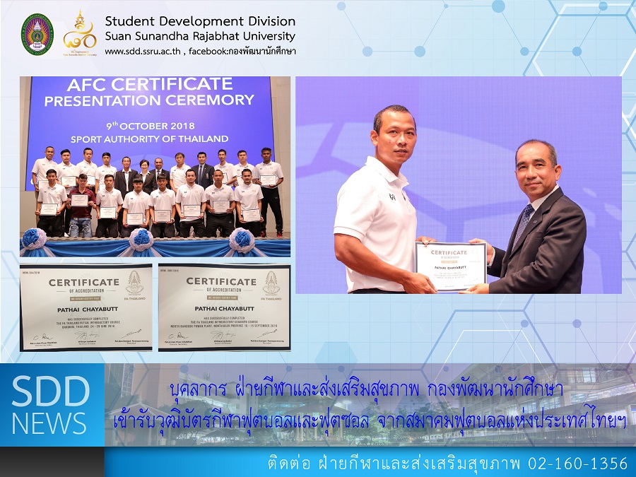 Congratulations to Mr. Pathai Chayabutt, Staff of Sport and Health Promotion Section who received both of FA Thailand Futsal Introductory Course Certificate and FA Thailand Football Introductory Course Certificate organized by FA Thailand on October 9, 2018 at 25th floor, His Majesty the King’s Birthday Anniversary Building, Sports Authority of Thailand. This certificate ceremony of AFC Coaching Certificate Course 2017/2018 led by Ms. Lakkananan Laksameeanan (Vice-Chairperson for Finance and Accounting), Mr. Witthaya Laohakul (Vice-Chairperson for Technique Development), Mr. Lim Kim Chon (Deputy Director of Technique Development), Mr. Yodsawat Dhamrongkulwisit (Vide-Chairperson for Personnel Development and Futsal Training) and Mr. Boonlert Chareonwong (MC) congratulated the participants in connection with this milestone.