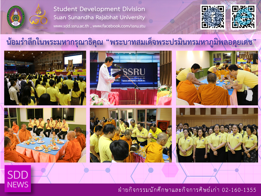 (12 Oct 2018), Over 400 SSRU faculty, staff and students gathered to join the Student Development Division-organized ceremony in memoriam of the late King Bhumibol Adulyadej on 4th floor, Health and Sport Center Building. At this commemorative event, Assoc. Prof. Dr. Luedech Girdwichai, President presided the ceremony with food offering to 10 monked, candle light to pay homage and Royal Anthem singing alongside with SSRU members to remember and honour our beloved late King Bhumibol Adulyadej, who passed away on this day two years ago.