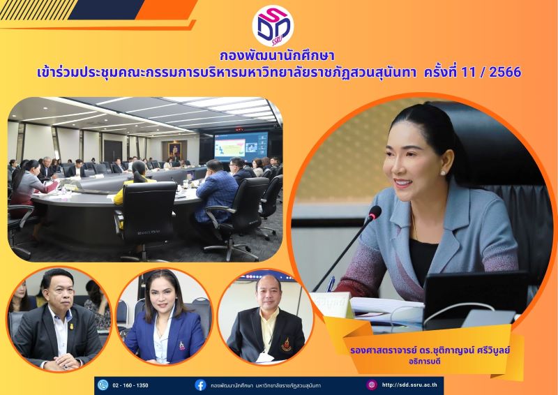 คณะกรรมการบริหารมหาวิทยาลัยราชภัฏสวนสุนันทา ครั้งที่ 11 / 2566 ณ ห้องประชุมสภามหาวิทยาลัย อาคาร 31 ชั้น 5 โดยมี รองศาสตราจารย์ ดร.ชุติกาญจน์ ศรีวิบูลย์ อธิการบดี