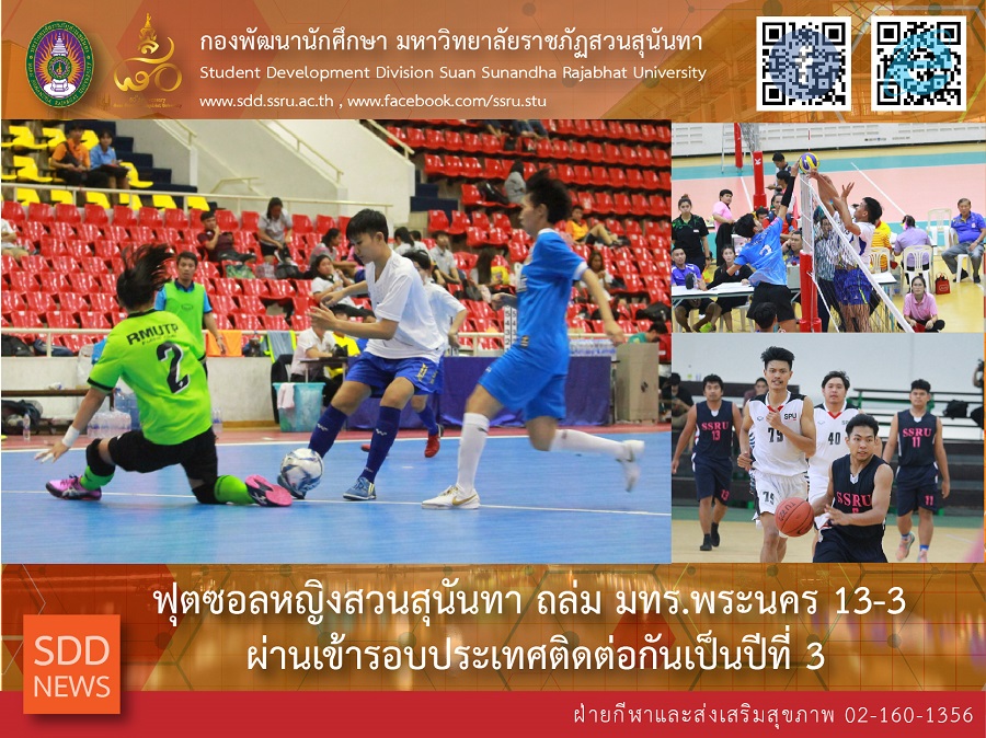 The Futsal team (Women’s) got the 3rd year of Nation Round by 13-3 beat Phranakhon Rajabhat University (PRU), the Volleyball team (Women’s) was beaten by Dhurakij Pundit University (DPU) 0-3, the Volleyball team (Men’s) was beaten by Srinakharinwirot University (SWU) 2-3, the Beach Volleyball team (Men’s) was beaten by Chandrakasem Rajabhat University (CRU) 0-2 and the Basketball team (Men’s) was 56-40 beat Rajamangala University of Technology Krungthep (RUTK).