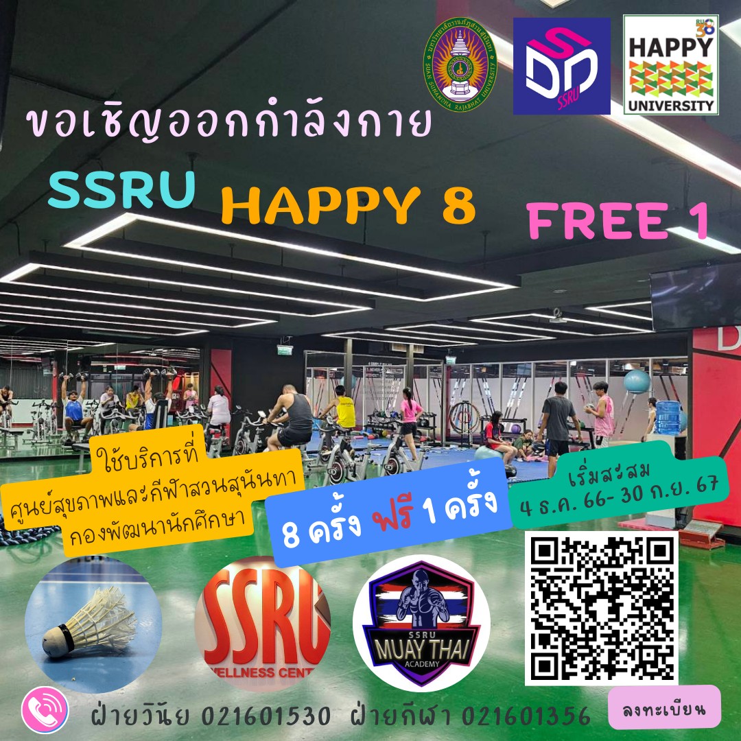 กองพัฒนานักศึกษา มหาวิทยาลัยราชภัฏสวนสุนันทา ขอเชิญออกกำลังกาย ในกิจกรรม SSRU Happy 8 Free 1 เมื่อใช้บริการศูนย์สุขภาพและกีฬาสวนสุนันทา ออกกำลังกาย 8 ครั้ง แถมฟรี 1 ครั้ง เริ่มสะสม 4 ธันวาคม 2566 -30 กันยายน 2567