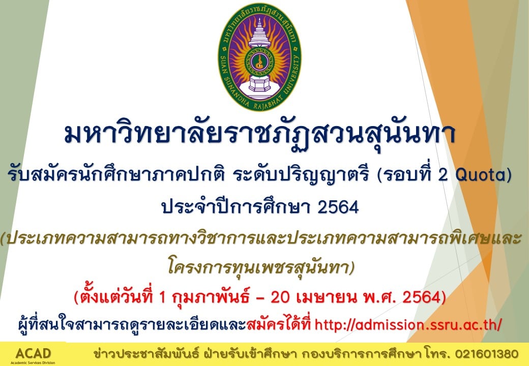 มหาวิทยาลัยราชภัฏสวนสุนันทา รับสมัครนักศึกษาภาคปกติ ระดับปริญญาตรี (รอบที่ 2 Quota) ประจำปีการศึกษา 2564 (ประเภทความสามารถทางวิชาการและประเภทความสามารถพิเศษและโครงการทุนเพชรสุนันทา)