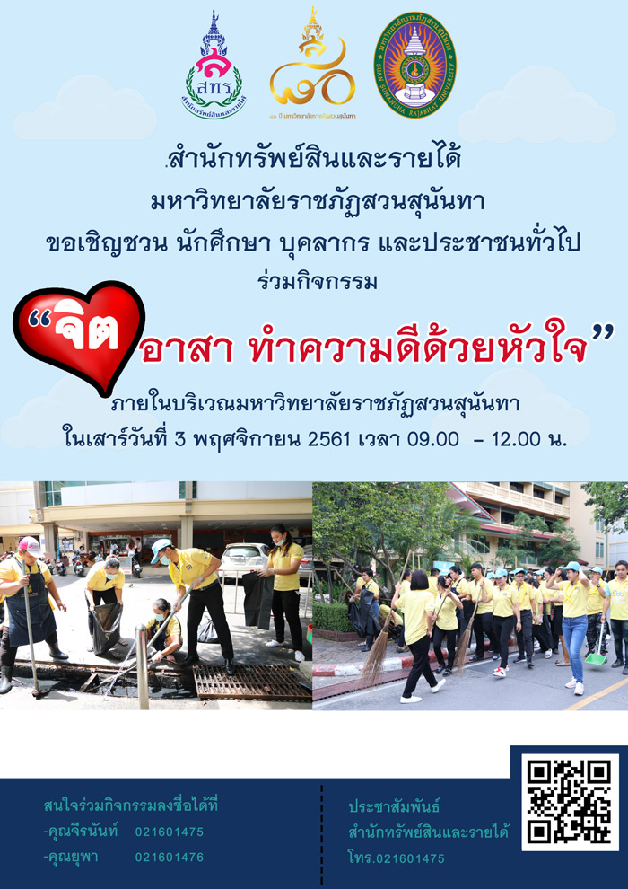 สำนักทรัพย์สินและรายได้ มหาวิทยาลัยราชภัฏสวนสุนันทา ขอเชิญชวนนักศึกษา บุคลากร และประชาชนทั่วไป