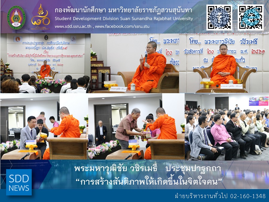 วันอังคารที่ 20 พฤศจิกายน พ.ศ. 2561 มูลนิธิการศึกษาเพื่อสันติภาพ พระธรรมปิฎก (ป.อ.ปยุตฺ โต) ร่วมกับ กองพัฒนานักศึกษา มหาวิทยาลัยราชภัฏสวนสุนันทา จัดกิจกรรมการประชุมปาฐกถา ชุด การศึกษาเพื่อสันติภาพ พระธรรมปิฎก (ป.อ.ปยุตฺ โต) ครั้งที่ 19 เรื่อง การสร้างสันติภาพให้เกิดขึ้นในจิตใจคน โดยกระบวนการศึกษาพระพุทธศาสนา ขึ้น โดย พระมหาวุฒิชัย วชิรเมธี เป็นพระวิทยากร