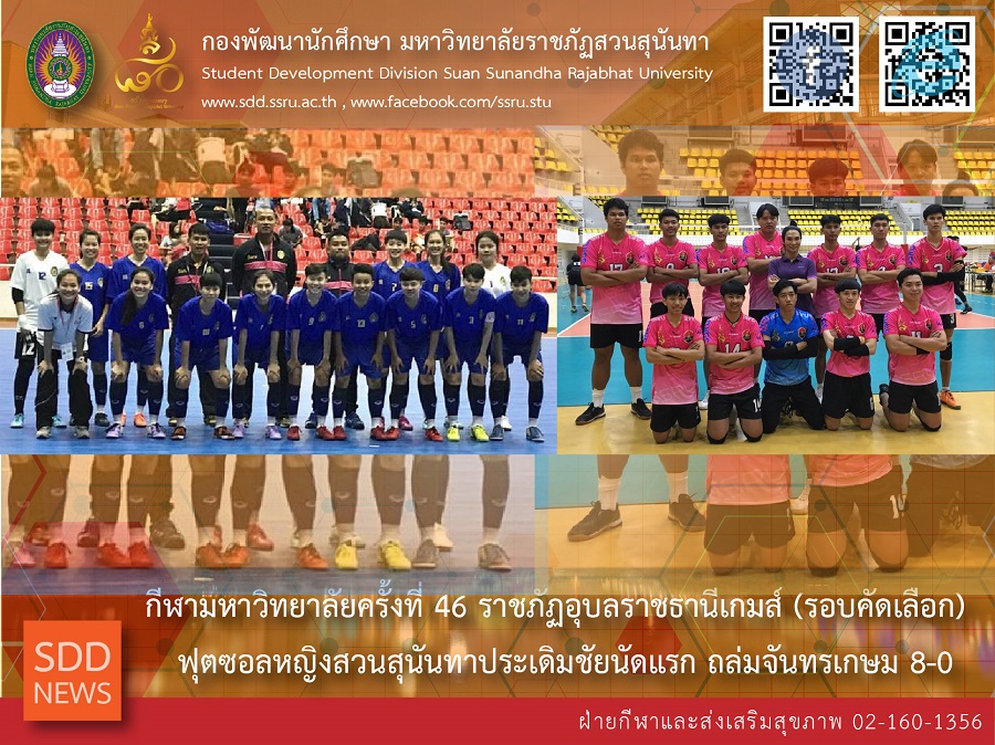 กีฬามหาวิทยาลัยแห่งประเทศไทย ครั้งที่ 46 ราชภัฏอุบลราชธานีเกมส์ รอบคัดเลือก ซึ่งจัดขึ้น ณ มหาวิทยาลัยธรรมศาสตร์ศูนย์รังสิต จากการลงทำการแข่งขันในวันที่สอง มหาวิทยาลัยราชภัฏสวนสุนันทามีนักกีฬาลงทำการแข่งขันทั้งหมด 3 ชนิดกีฬา ได้แก่ ฟุตซอลหญิง ฟุตบอลชาย และวอลเลย์บอลชาย โดยทีมฟุตซอลหญิงที่ในปีที่แล้วสามารถไปไกลถึง รอบ 8 ทีมสุดท้าย ในปีนี้ลงทำการแข่งขันรอบคัดเลือกนัดแรก พบกับ ทีมมหาวิทยาลัยราชภัฏจันทรเกษม ผลปรากฏว่า ทีมฟุตซอลหญิงสวนสุนันทาประเดิมสนามนัดแรกได้อย่างยอดเยี่ยม ไล่ถล่มเอาชนะไปได้ด้วยสกอร์ 8 ประตู ต่อ 0