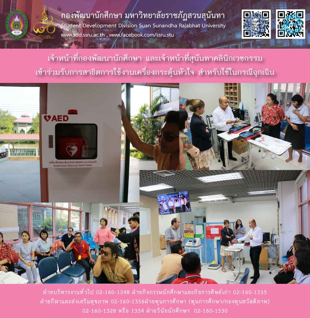บ่ายวันศุกร์ที่ 24 มกราคม 2563 เจ้าหน้าที่กองพัฒนานักศึกษา และเจ้าหน้าที่สุนันทาคลินิกเวชกรรม เข้าร่วมรับการสาธิตการใช้งานเครื่องกระตุกหัวใจไฟฟ้า (AED) สำหรับใช้ในกรณีฉุกเฉิน โดยเครื่องดังกล่าวได้รับการสนับสนุนงบประมาณจากคณะกรรมการส่งเสริมกิจการมหาวิทยาลัย และติดตั้งที่บริเวณประตูด้านหน้า ชั้น 1 อาคารศูนย์สุขภาพและกีฬา