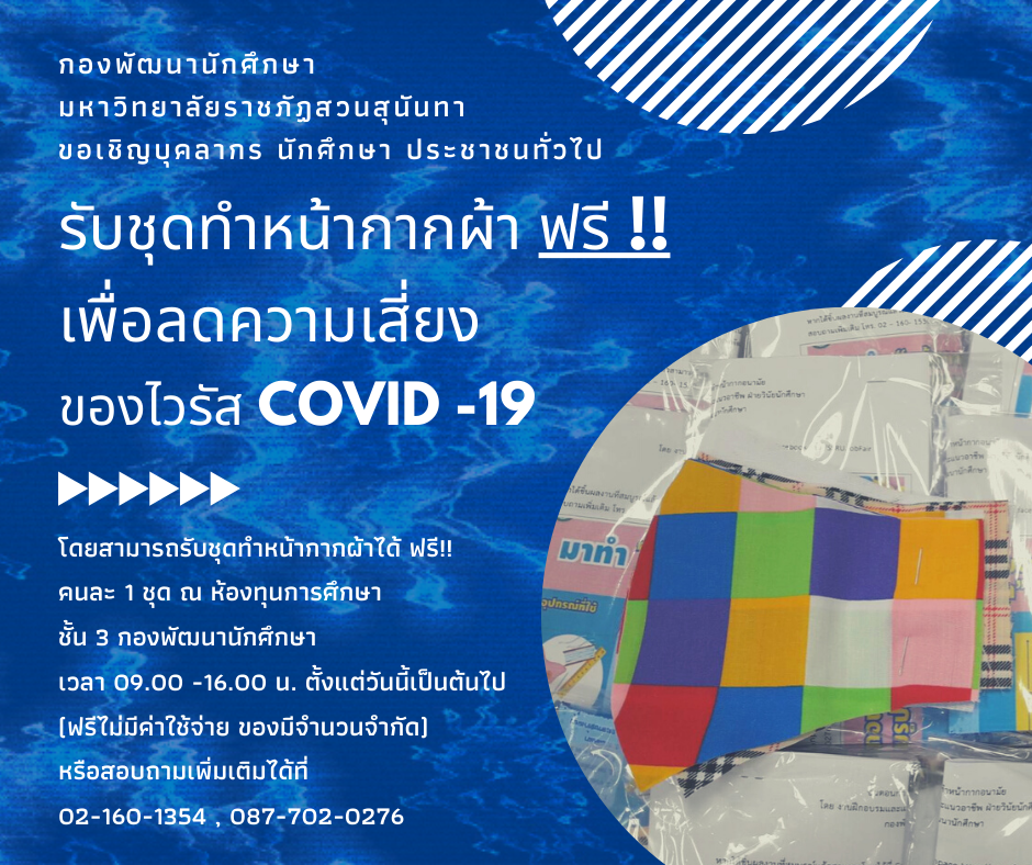 รับชุดทำหน้ากากผ้า ฟรี ! ! เพื่อลดความเสี่ยง ของไวรัส COVID -19 ได้คนละ 1 ชุด ณ ห้องทุนการศึกษา ชั้น 3 กองพัฒนานักศึกษา เวลา 09.00 -16.00 น. ตั้งแต่วันนี้เป็นต้นไป (ด่วนนนนน ของมีจำนวนจำกัด) หรือสอบถามเพิ่มเติมได้ที่ 02-160-1354 , 0877020276