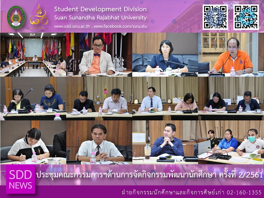 บ่าย วันที่ 25 ตุลาคม 2561 กองพัฒนานักศึกษา โดยฝ่ายกิจกรรมนักศึกษาและกิจการศิษย์เก่า จัด การประชุมคณะกรรมการปฏิบัติงานด้านการจัดกิจกรรมพัฒนานักศึกษา มหาวิทยาลัยราชภัฏสวนสุนันทา ครั้งที่ 2/2561 ขึ้น ณ ห้องประชุมวรลักษณานงค์ ชั้น 3 อาคารศูนย์สุขภาพและกีฬา โดย ผศ.ดร.ชนนาถ มีนะนันทน์ รองอธิการบดีฝ่ายกิจการนักศึกษา เป็นประธานในการประชุมดังกล่าว